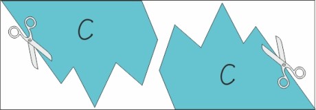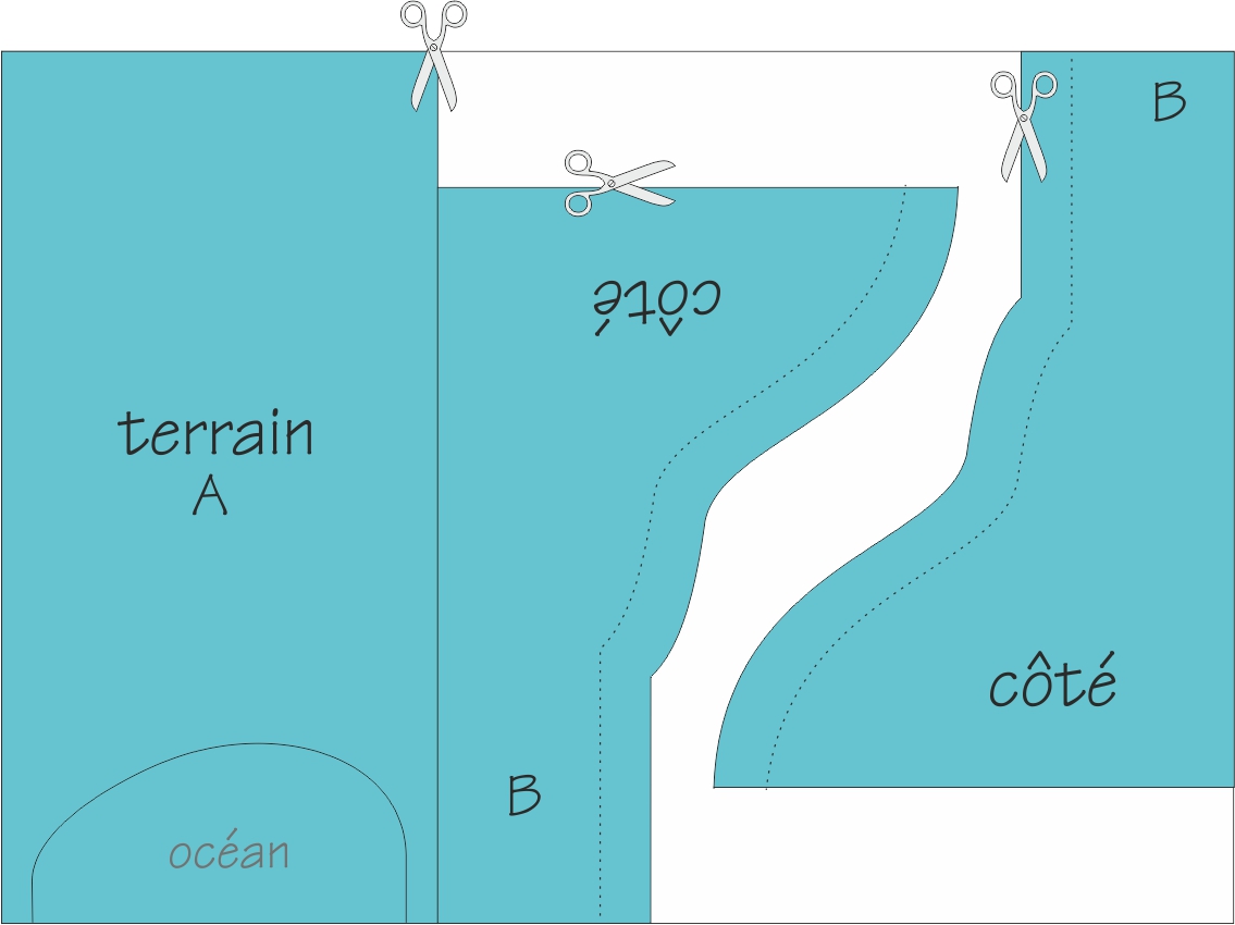 Cut out the 3 pieces (A + B x2) with scissors, but not yet the opening representing the ocean.