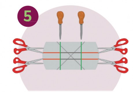 Découper quatre fentes horizontales  et marque légèrement les deux lignes verticales avec un poinçon  et une règle.