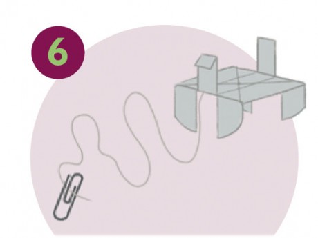 Plier le carton pour former  un animal. Scotche l’extrémité du fil de pêche sous son cou. Attacher un trombone  à l’autre bout du fil. Ajouter au trombonne des morceaux de carton pour faire du poids.